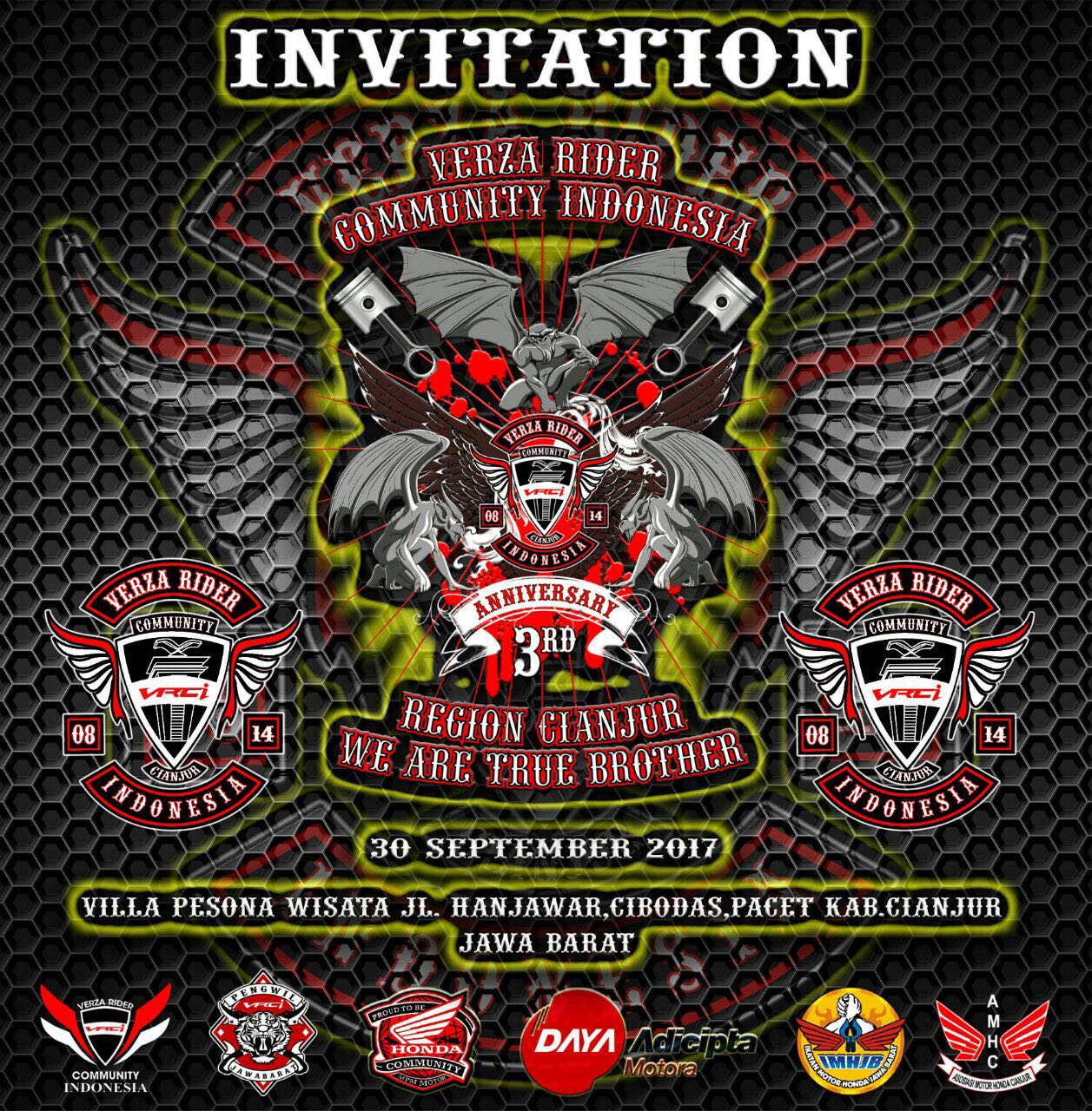 Kawan-kawan.... Sabtu akhir pekan ini (30/9), Verza Riders Community Indonesia Region Cianjur akan menggelar hari jadinya yang ke-3 dengan Acara 3rd Anniversary Verza Riders Community Indonesia Region Cianjur.