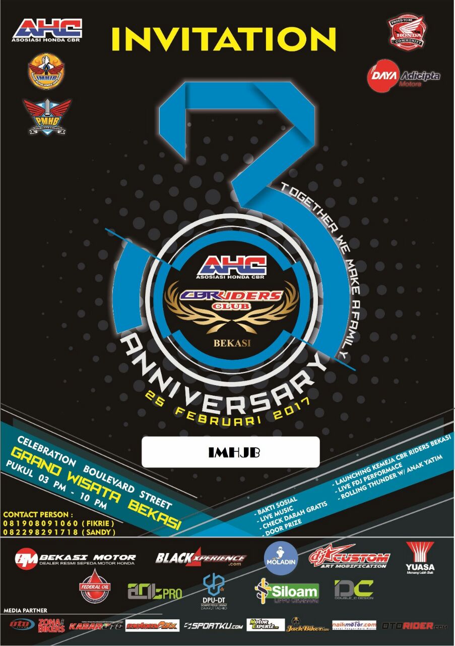 Nah untuk kawan-kawan anggota klub yang yang tergabung dalam paguyuban Ikatan Motor Honda Jawa Barat diundang untuk turut andil dalam acara 3rd Anniversary CBR Roders CLub Bekasi yang akan digelar 25 Februari 2017 di Celebration Boulevard Street Grand Wisata Bekasi.