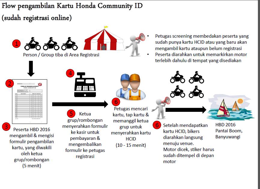 sebelum menuju lokasi Honda bIkers Day 2016 di Pantai Boom, kalian semuanya para bikers akan melakukan chekin dulu untuk mengambil kartu pembayaran registrasi untuk bisa ditukarkan mendapatkan makan dan lain lain pas dilokasi, untuk pengambilan Kartu HCID yang baru daftar sebaiknya dilakukan per grup atau kalau dikota kalian paguyuban lebih enak dijadikan satu untuk pengambilannya kita akan bahas ya untuk pengambilan melalui grub atau paguyuban kota