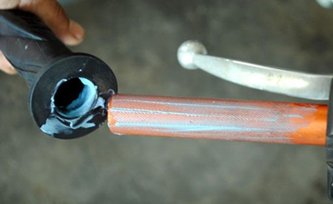 Grip setang baru pasti sulit dipasangkan ke setang. Cara pasang yang paling gampang, setang dan grip dilumuri oli pasti langsung masuk.