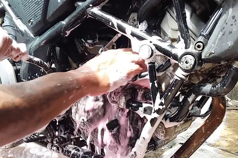 Cara terbaik saat mencuci yaitu dengan menyemportkan air terlebih dahulu pada bagian kaki-kaki sepeda motor, misalnya ban, spakbor, velg, dan body sektor bawah, lalu baru body bagian atas.