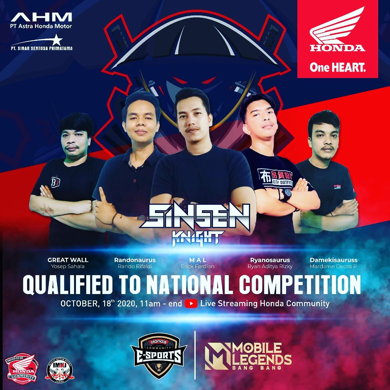 Proses kualifikasi cukup seru, dimana setiap pertandingan antar tim hanya berlangung selama 1 kali pertandingan (best of one). PT.Sinar Sentosa Primatama selaku main dealer honda di  Provinsi Jambi mengirim 5 utusan tim yang berlaga di kompetisi ini. Dimulai dari Tim Sinsen’s Knight White yang diketuai oleh Alan dari Jambi CBR Club, Sinsen’s Knight Blue dengan diketua oleh Hoky, Sinsen’s Knight Black dengan diketuai oleh Erick Ferdian dari Jambi CBR Club, Sinsen’s Knight Pink dengan diketuai oleh Ary Lesmana dari Honda BeAt Club Indoesia Sungai Bahar, dan Sinsen’s Knight Red dengan diketuai oleh Vincent. Masing tim yang terdiri dari 5 orang sudah melakukan tahap seleksi yang cukup ketat pada beberapa hari yang lalu dan ditetapkan sebagai perwakilan dari Sinar Sentosa untuk berlaga di kompetisi Nasional ini. Dalam proses kualifikasi pertandingan diadakan secara online namun pertandingan tidak disiarkan secara langsung. Proses kualifikasi mencari 8 tim yang lolos ke babak quarter final dan kemudian nanti akan dilangungkan pertandingan dari quarter final hingga final pada minggu(18/10).